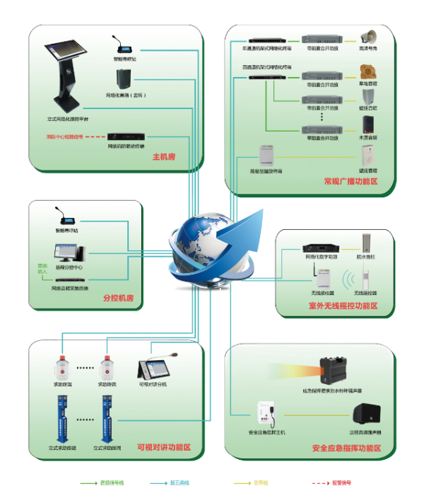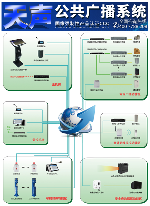 擴展的靈活性,單套系統可添加多達(dá)數千個終端,同時還可以採(cǎi)用多服務器架構實現接入更多的終端,可以在室外終端加上功放加分區器的形式達(dá)到一小型的終端系統,可擴展多個分控站,安裝由我公司開發的軟件,與互聯網連接就可以拿到控制權限。