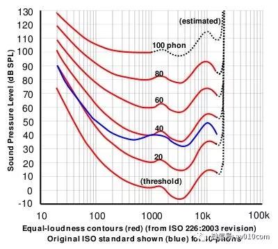 1933年,貝爾實驗室的兩位研究員 Harvey Fletcher和 W.A Munson開創瞭這類實驗,此後又被其他人多次實驗並證實。2003年,國際标準化組織(ISO)結合曆史上各個實驗的結果,發布瞭 ISO 226:2003 标準。下圖就是 ISO 226:2003 等響曲線的标準圖。