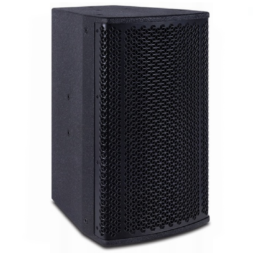單邊形斜面箱體結構,正面透聲網孔 , 二分頻設計,低頻更加飽(bǎo)滿,聲壓覆蓋均勻,聲音層次分明,減少延時回聲且能将聲音清晰傳達到每個角落,並(bìng)保證場内每個位置都能聽到真實自然的聲音 。