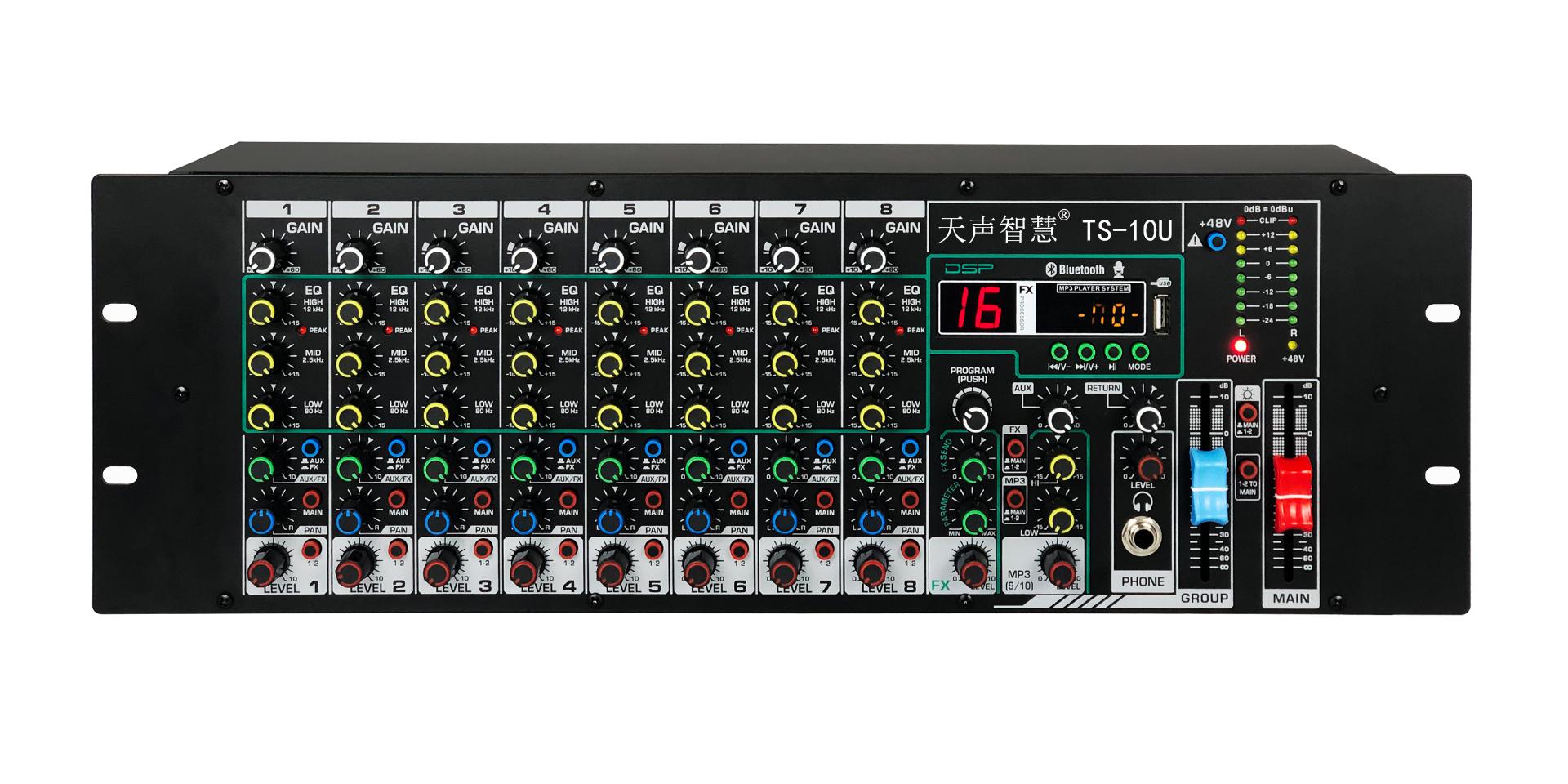 專業兩編組輸出調音台;10個輸入通道,8個話筒輸入,2立體聲線路輸入1組輔助輸出,1個返回;标準的機架尺寸,可直接上機架安裝;通道三段均衡調(diào)節,高、中、低音單(dān)獨調(diào)節;内置24-Bit DSP數字果器内置高品質MP3播放器,帶USB接口、錄音功能、藍(lán)牙連(lián)接功能  +48V幻象電源;高精度三色精確(què)電平柱,準確(què)顯示輸出電平;内置式靜噪開關電源器,全球通用;機身耐用輕巧。适用於(yú)中小型多功能廳、會議廳、宴會廳、學校、禮堂、酒店、公共廣播、固定安裝、錄音室等場所。