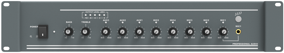 輸(shū)入:MIC1,2,3,4,5:2.5mV,不平衡;AUX1,2,3:250mV,不平衡